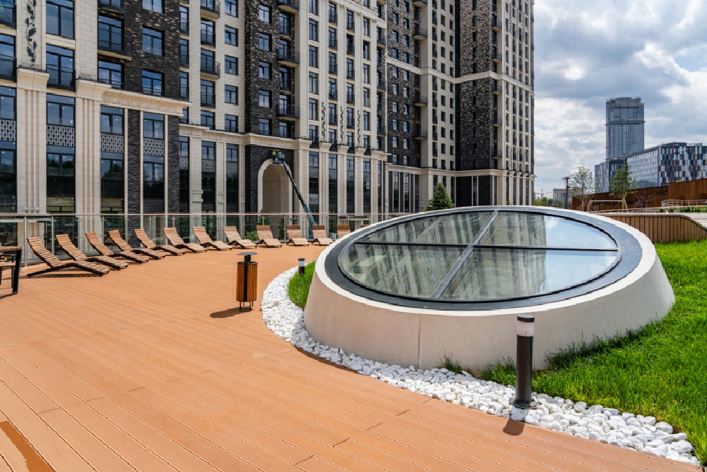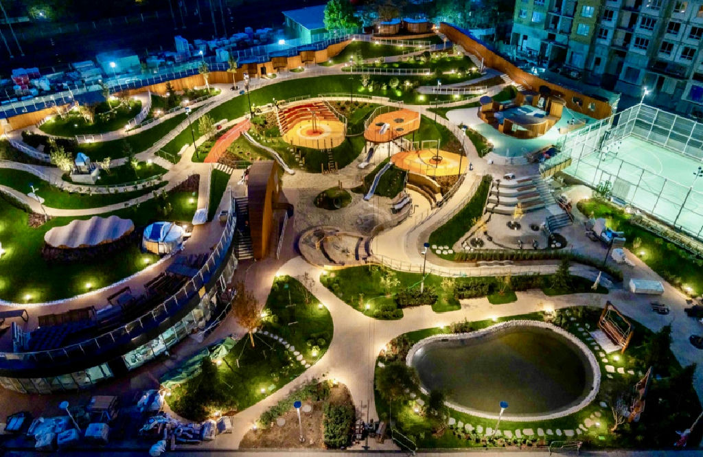 Закрытый двор-парк 1,7 га с прудами, фонтанами, террасами и детскими площадками